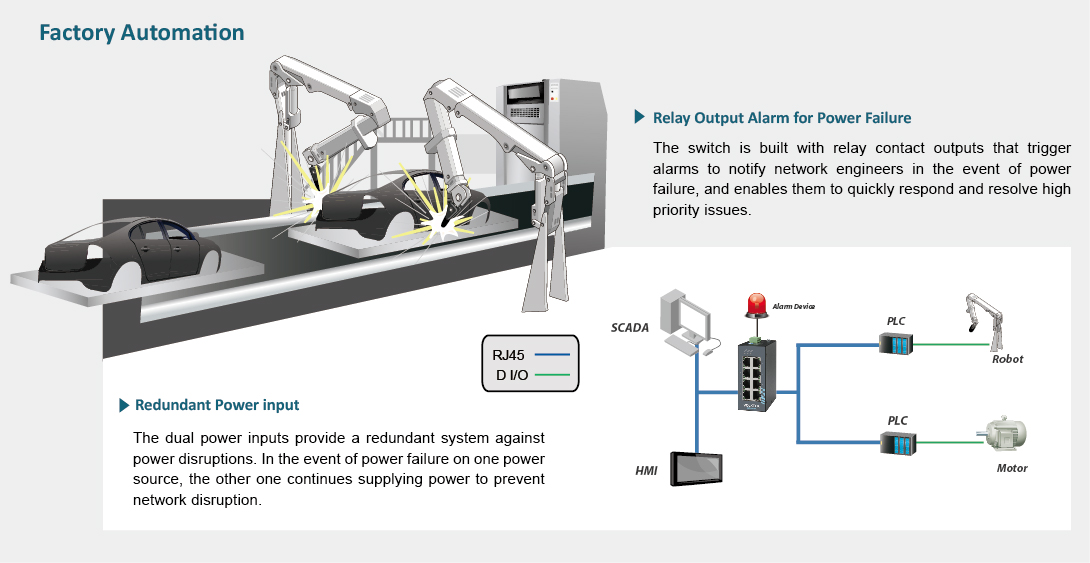 | 可靠性 | 冗餘電源和警報繼電器 | 在停電期間保持運行並通知用戶 | 內建防浪湧保護、雙電源和電池備份,確保設備穩定運行,24/7 網絡可靠性。 |